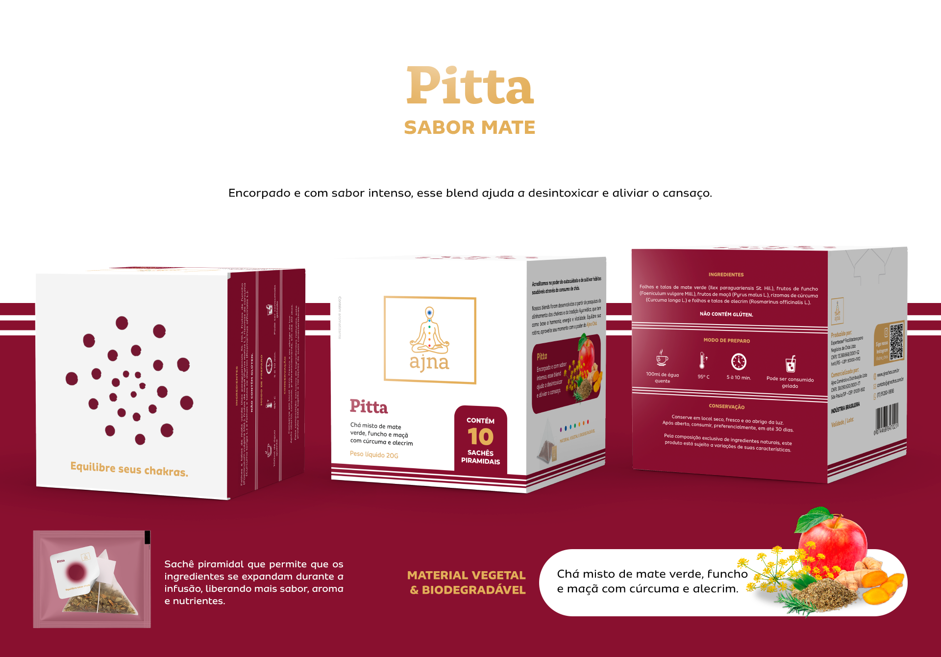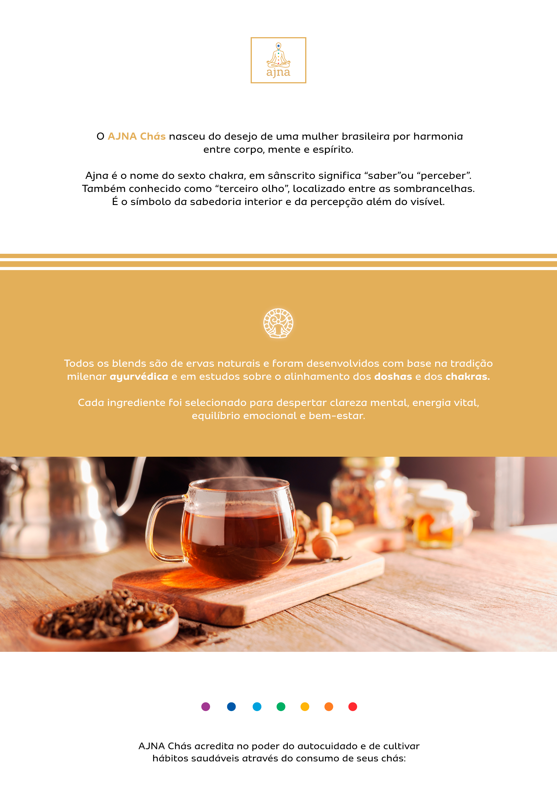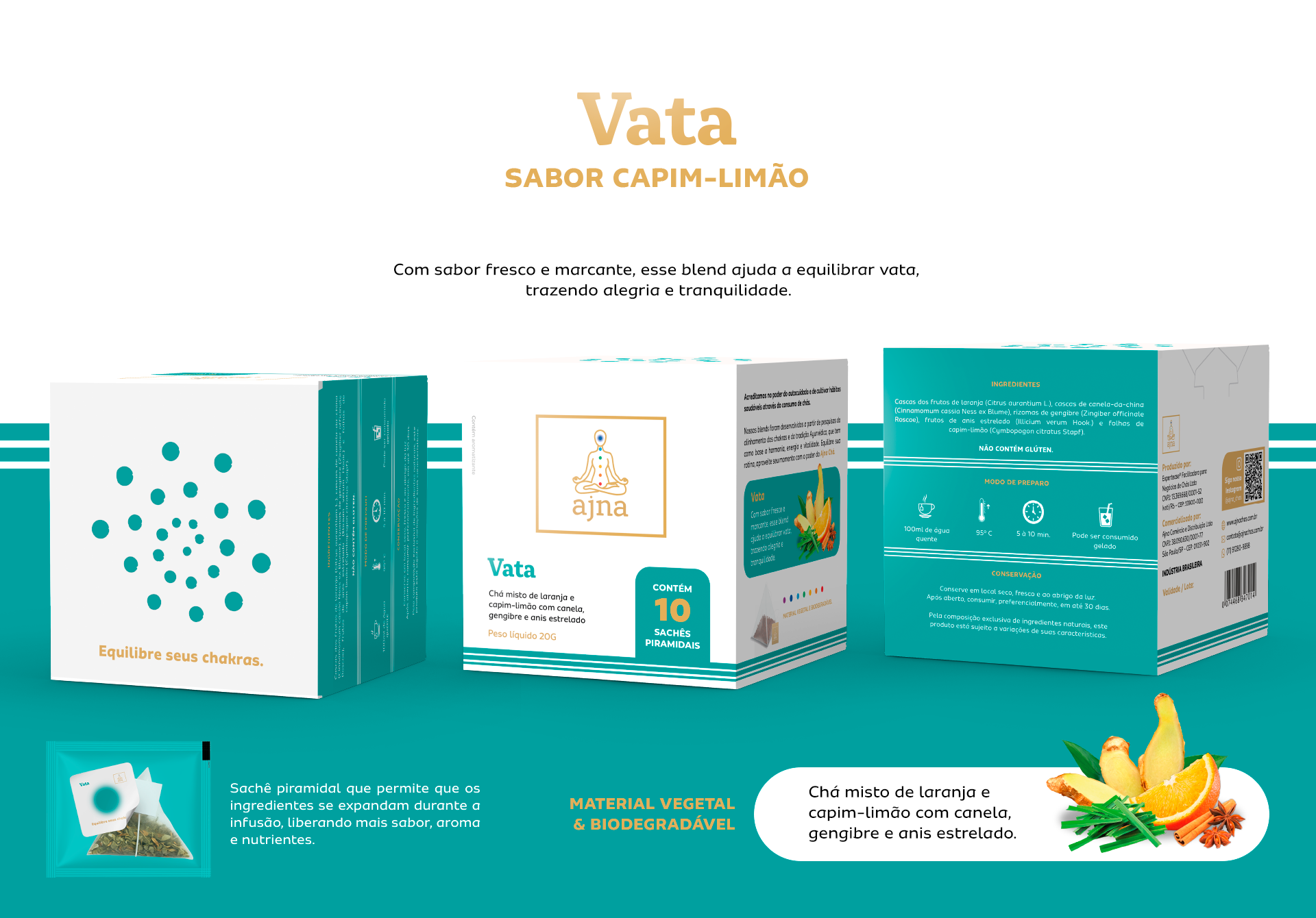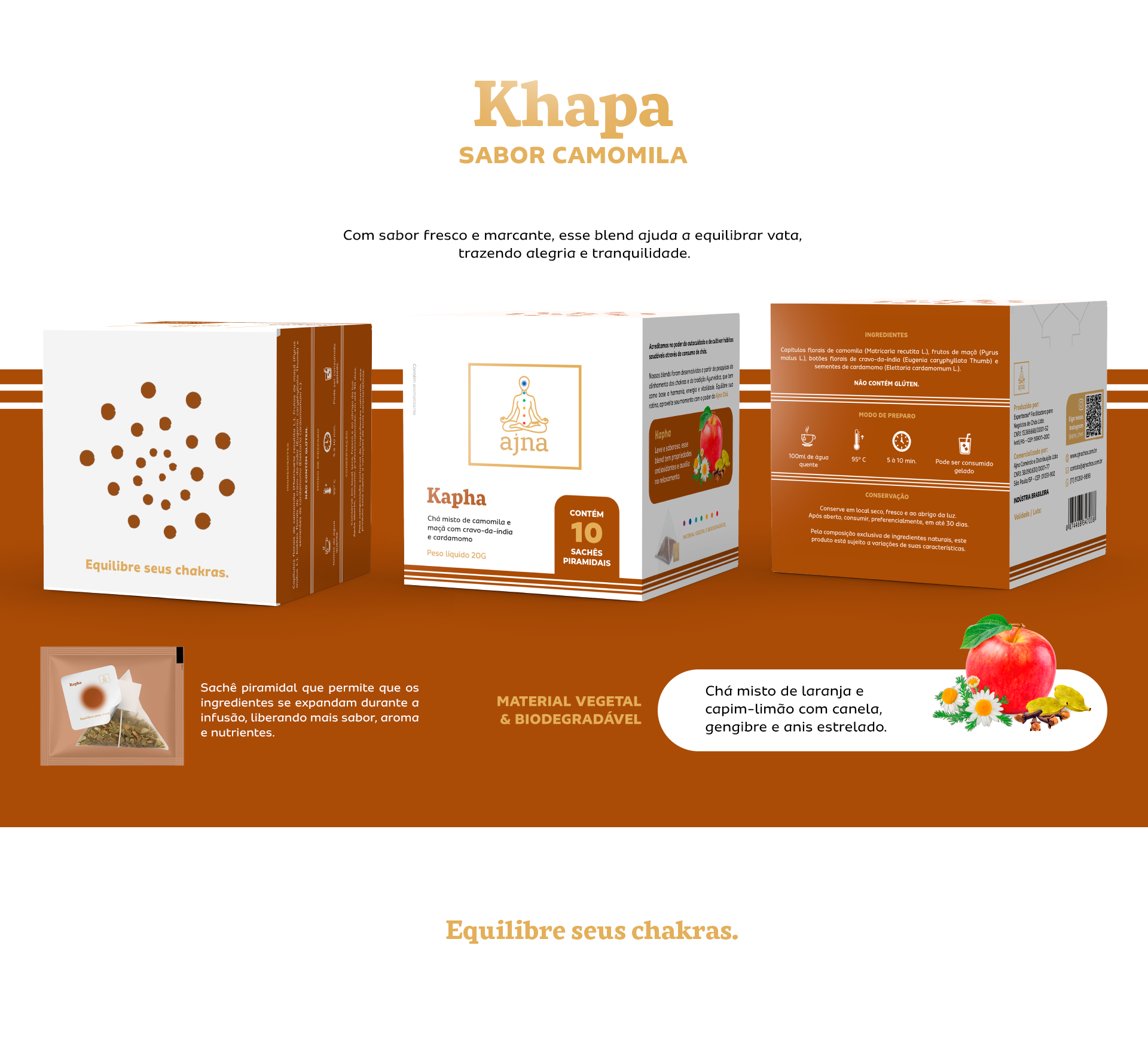 Desenvolvimento de embalagens para a linha de chás artesanais da AJNA, uma marca focada na tradição Ayurvédica e em estudos sobre alinhamento dos dochas e chakras.