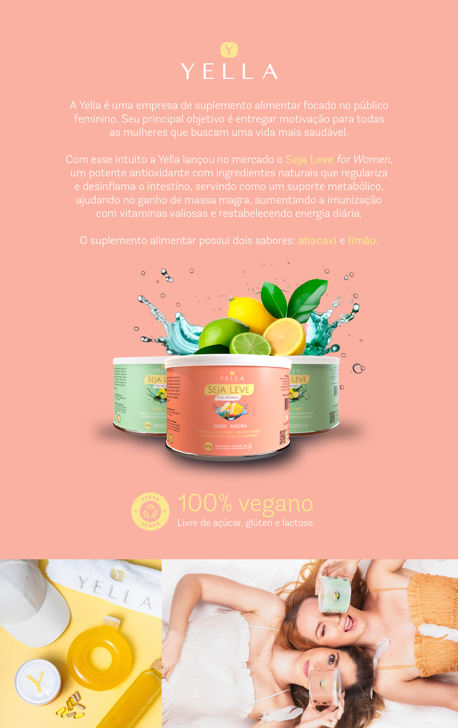 Desenvolvimento das embalagens para linha Seja LeveFor Women, um modulador intestinal feito com ingredientes naturais, pertencente a Yella Life,marca de suplementos focado no público feminino.